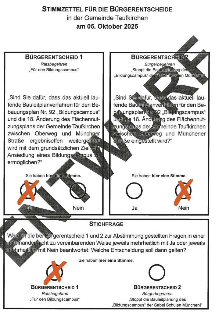 Deswegen können wir Ihnen nur empfehlen, stimmen Sie am 5. Oktober beim Ratsbegehren mit JA, beim Bürgerbegehren mit NEIN und bei der Stichfrage FÜR das Ratsbegehren. Denn bei Stimmengleichheit zwischen Rats- und Bürgerbegehren entscheidet die Stichfrage. Deshalb: Drei Kreuze am 5. Oktober.