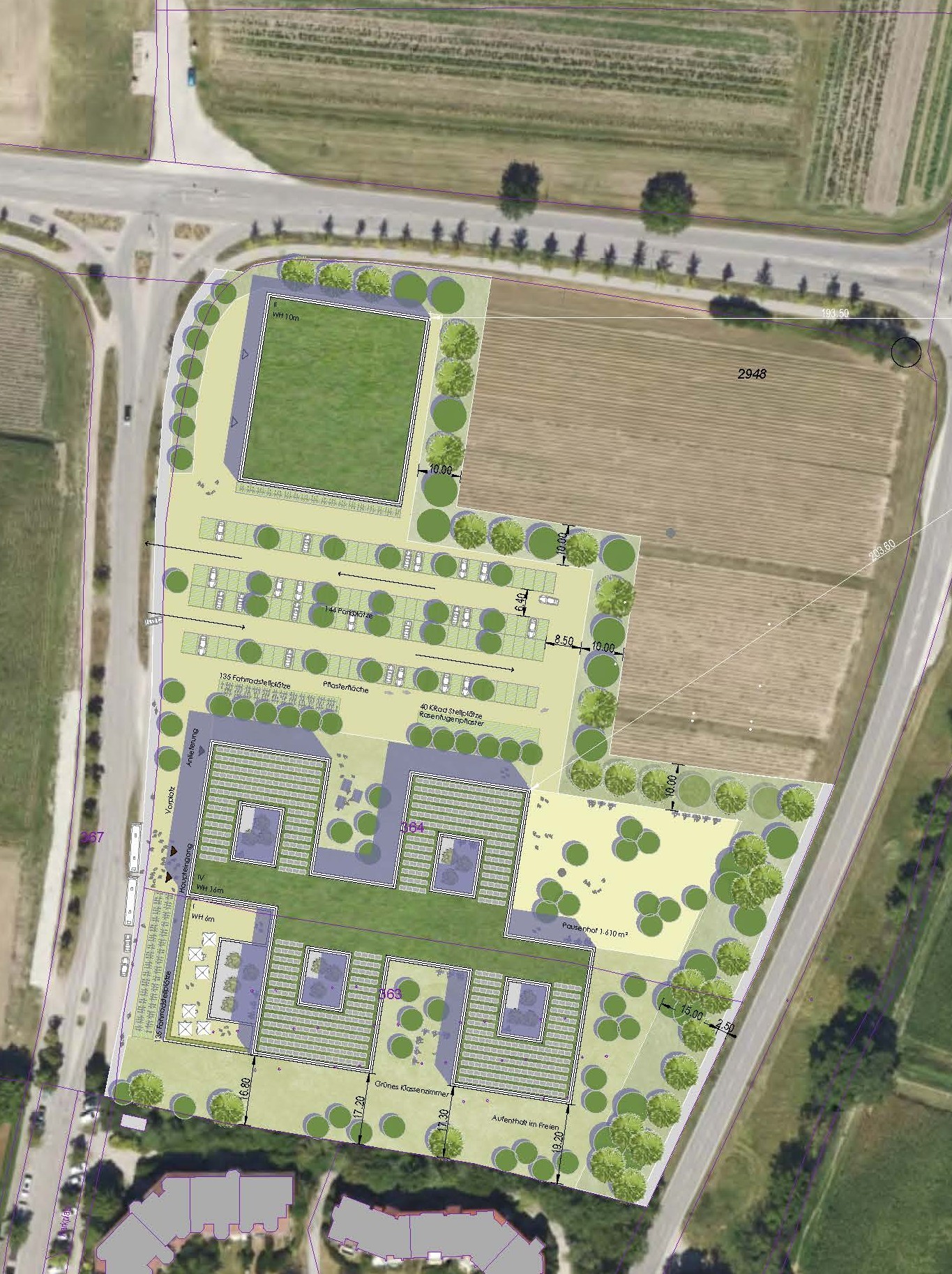 Auch die Freiflächenplanung übertrifft die gesetzlichen Vorgaben deutlich. Während die Schulbauverordnung Bayern drei Quadratmeter Pausenhoffläche pro Schüler vorsieht, bietet der Campus insgesamt über 5.700 Quadratmeter Pausenflächen, davon mehr als 4.000 Quadratmeter Grünflächen. Damit entsteht ein großzügiger Außenbereich, der Bewegung und Erholung fördert.